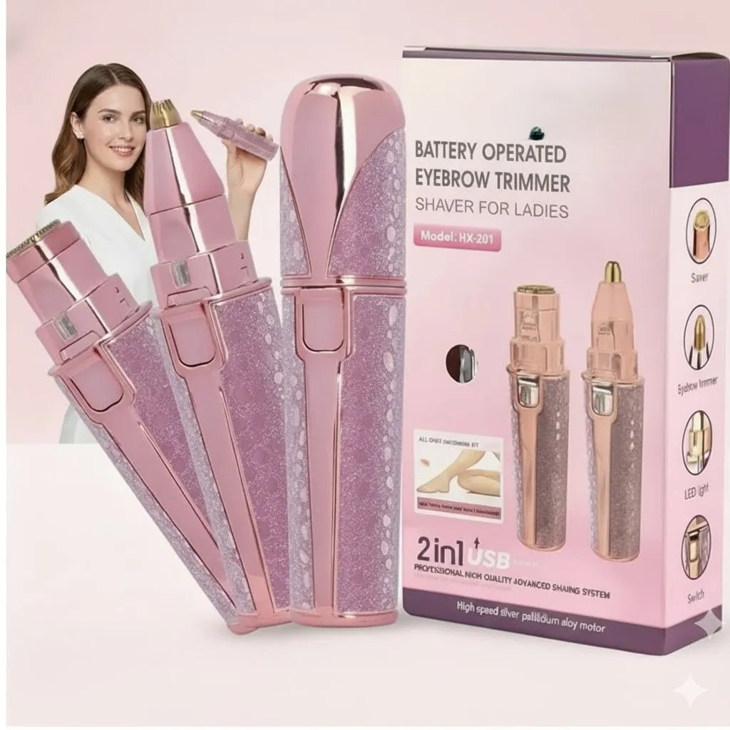 Get smooth, glowing skin anytime with our 2-in-1 Rechargeable Eyebrow Trimmer & Facial Hair Remover —designed for women who want painless, quick and precise grooming This advanced beauty tool features a bright LED light that helps you remove unwanted hair from your eyebrows, face, lip, chin, peach fuzz and bikini line with maximum accuracy.Powered by a USB rechargeable battery and a skin-friendly stainless-steel head , this trimmer glides gently on all skin types—especially sensitive skin . Its compact, travel-friendly design makes it perfect for daily touch-ups, office routines, and travel essentials. Whether you want clean brows or a smooth face, this painless precision shaver ensures no cuts, no redness, no irritation .