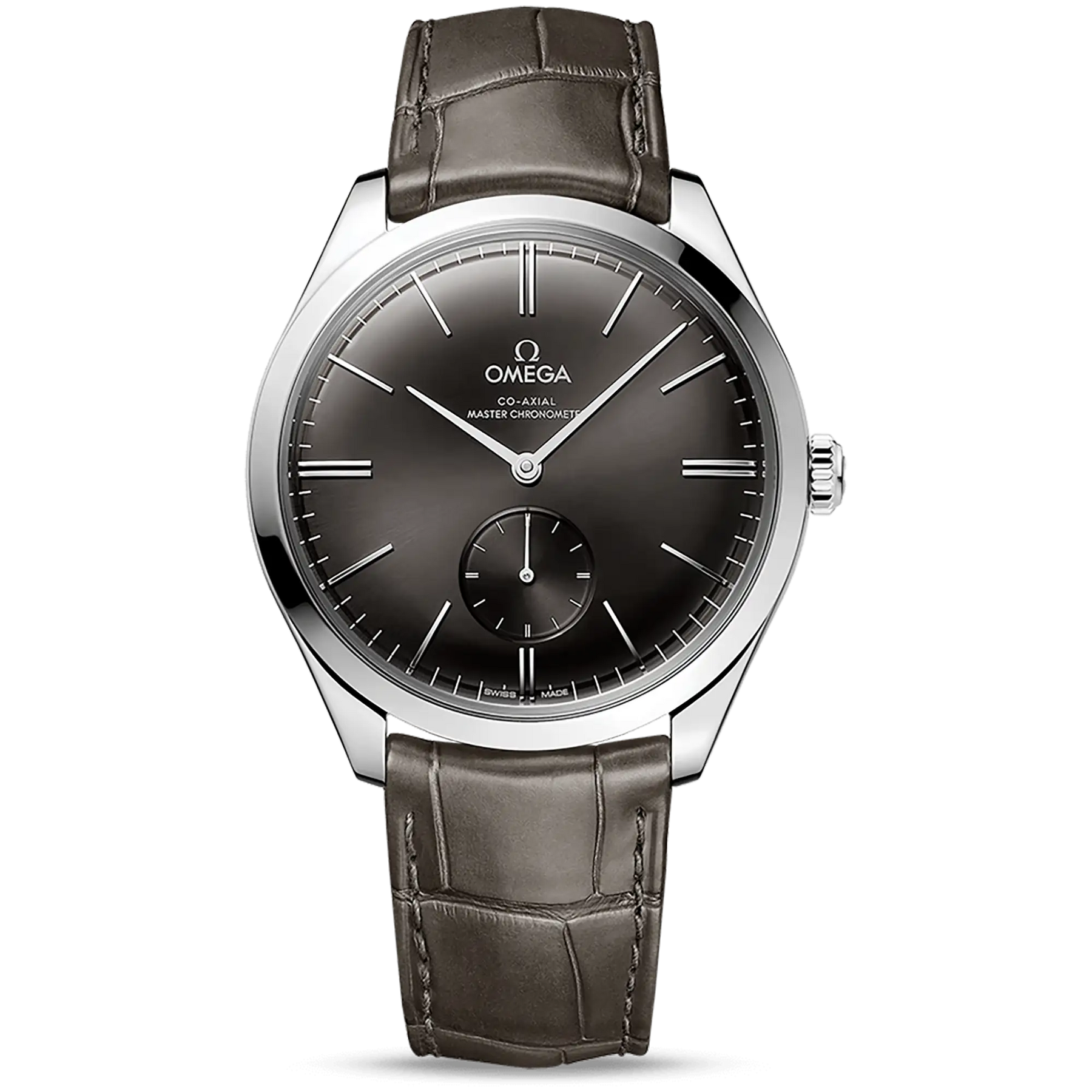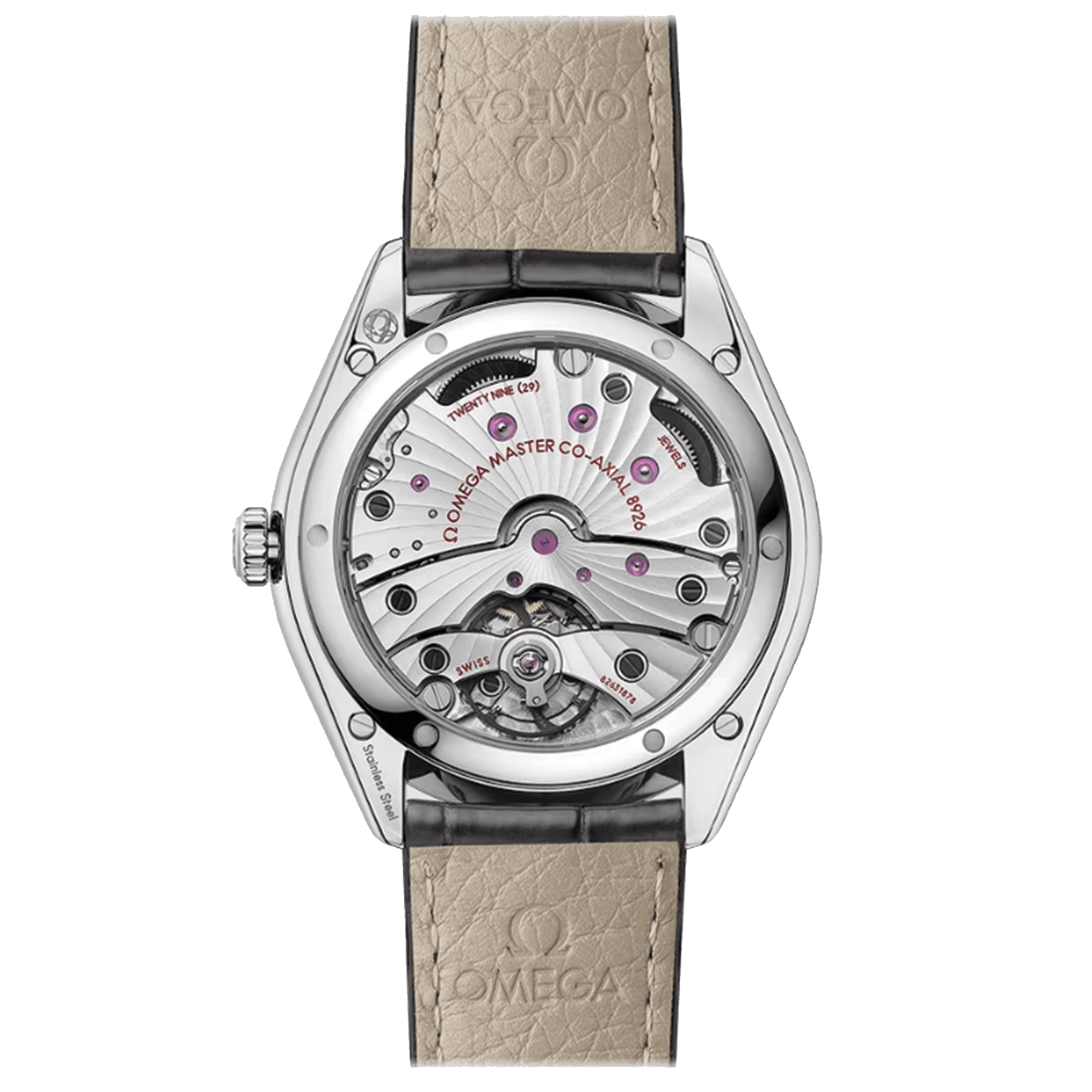 This Omega De Ville - A Master chronometer certified watch has a 40mm stainless steel case. Features an advanced mehanical movement, Leather strap, Scratch‑resistant sapphire crystal with anti‑reflective treatment on both sides and a domed grey dial with hands & indexes in 18k white gold. It has a water resistance of 30m