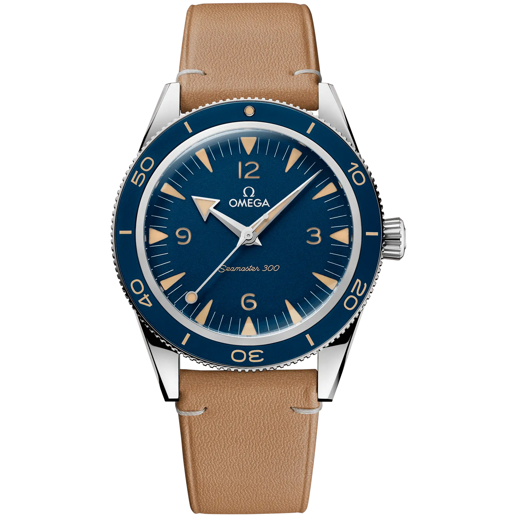 This Omega Seamaster - CO‑AXIAL MASTER CHRONOMETER watch has a 41mm stainless steel case with blue oxalic anodized aluminium bezel with super-luminova. This model also features an automatic movement, Leather strap, sapphire crystal and a Blue dial. It has a water resistance of 300m