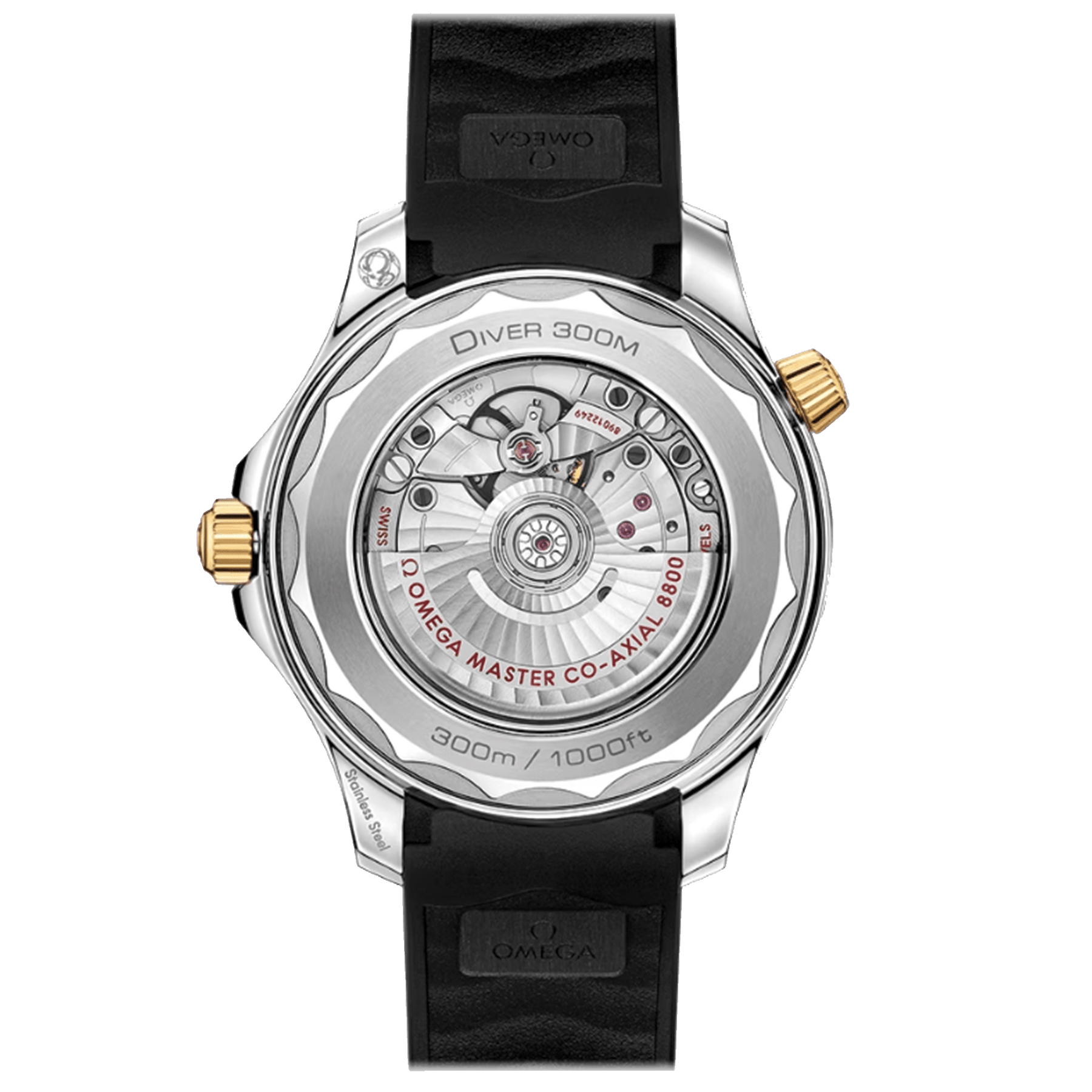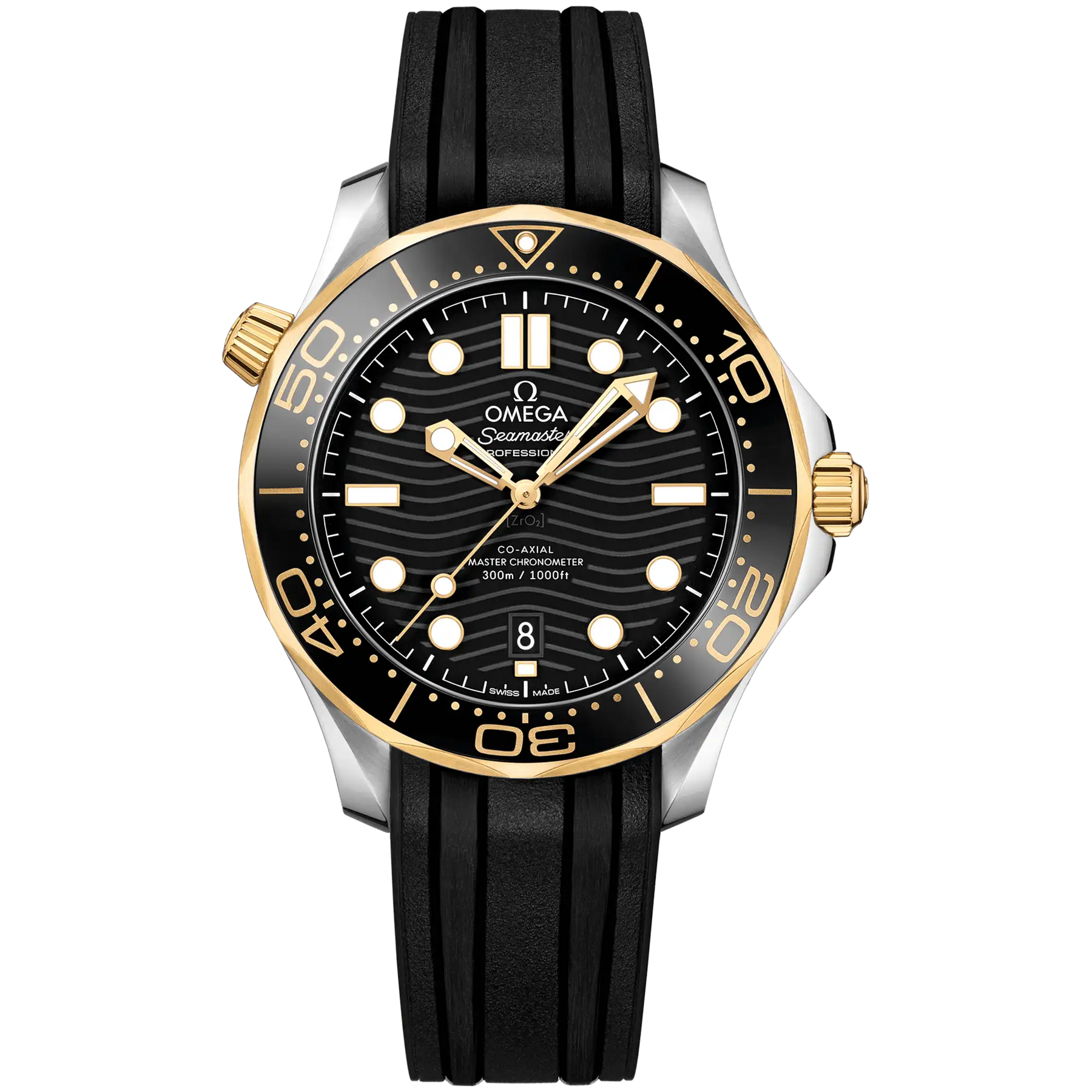 This Omega Seamaster - DIVER 300M CO‑AXIAL MASTER CHRONOMETER watch has a 42mm stainless steel case with 18K yellow gold. This model also features an automatic movement, Rubber strap, Domed scratch‑resistant sapphire crystal with anti‑reflective treatment on both sides and a Black dial with hands and indexes are 18K yellow gold and filled with white Super-LumiNova. It has a water resistance of 300m